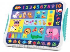 Kolorowe literki, ozdobione obrazkami, kryją w sobie wiele dźwięków! Razem ze zwierzakami, poznaj alfabet, naciskając na poszczególne literki, słuchając ich wymowy oraz wyrazu rozpoczynającego się na daną literę. W tablecie, poza trybem nauki, znajdziemy też tryb gry, w której zadaniem malucha będzie udzielać odpowiedzi na pytania, poprzez naciśnięcie na właściwy obrazek. Zabawka wyposażona została także w wesołe melodie oraz praktyczny przełącznik ON/OFF, umożliwiający wyłączenie tabletu po zakończonej zabawie.