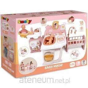 i sypialni. Zestaw zawiera 19 akcesoriów, w tym: w kuchni: krzesełko, mikrofalówkę, zlewozmywak z kranem oraz garnek, talerzyk i buteleczkę do karmienia. W strefie łazienkowej: wyjmowana wanienka, prysznic, przewijak, pojemniczki oraz ramka na zdjęcia. Strefa sypialniana to kołyska z karuzelą oraz lampką z kloszem świecącym w ciemności. Cały domek można łatwo złożyć i przetransportować w inne miejsce. Dla lalek do 42 cm (brak lalki w zestawie). Znaczna część wykorzystanego do produkcji plastiku pochodzi z recyklingu. Wyprodukowano we Francji.