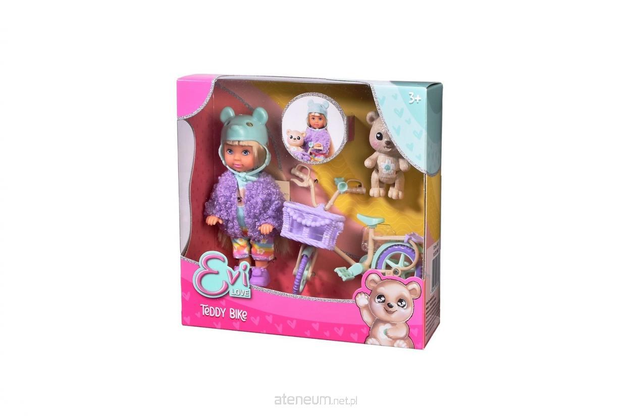 Evi ma na sobie puszystą kurtkę, kask w kształcie misia, buty i swojego ukochanego misia w koszyku na rowerze, Evi jeździ na swoim pastelowym rowerze w towarzystwie uroczego misia, co zapewnia jej dodatkową zabawę, 12 cm, 3l+
