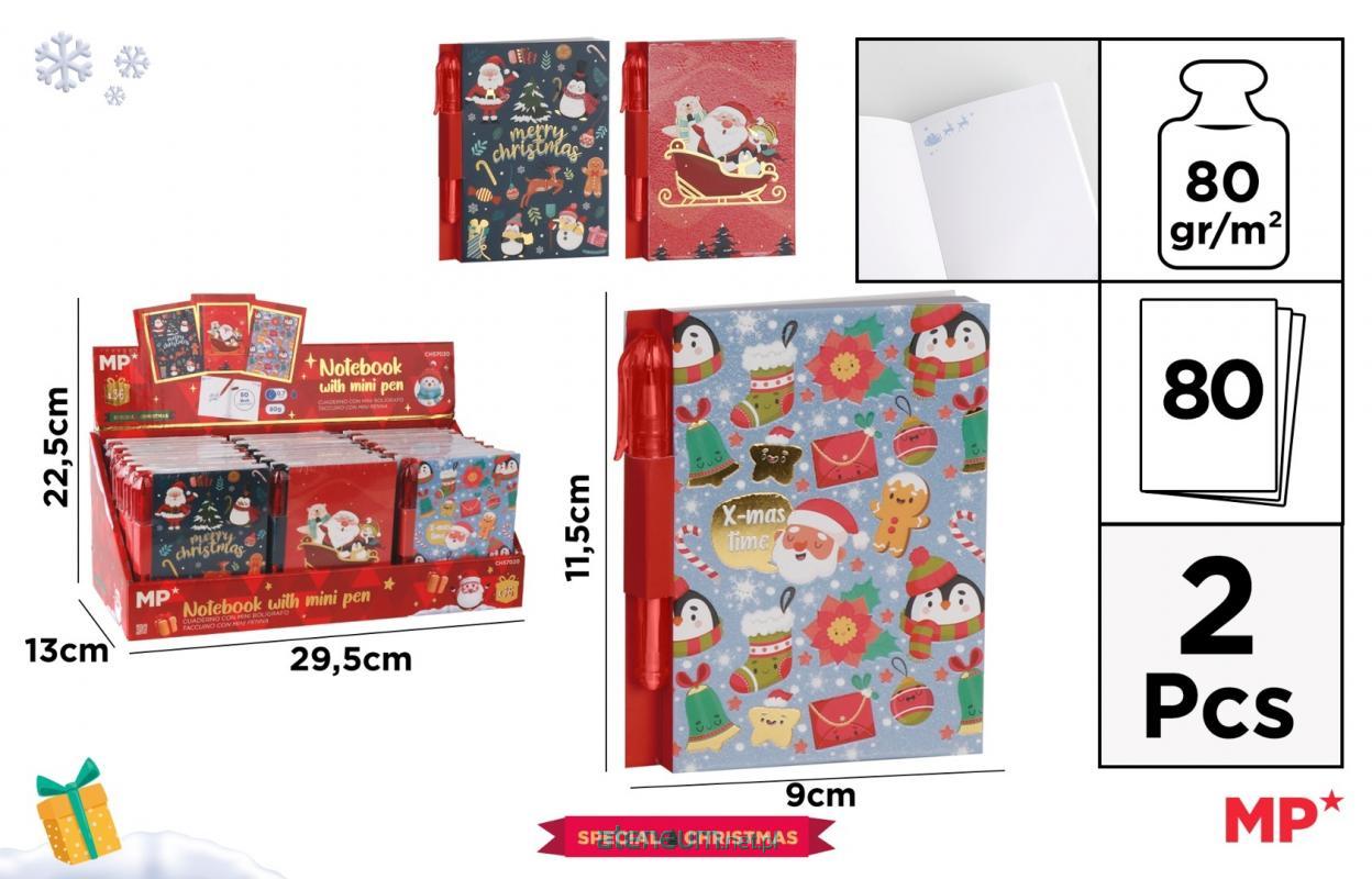 Notatnik: 9 11,5 cm, okładka z białego kartonu 300gr, 80 stron z papieru 80gr, druk monochromatyczny, oprawa klejona. Długopis jest przymocowany do krawędzi notatnika.