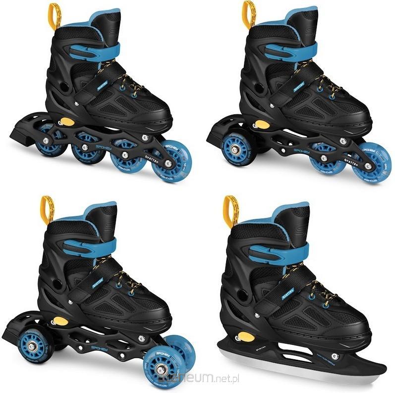 Rolki 4w1 rolki, wrotki, rolko-wrotki oraz łyżwy. Płoza rolkowa wykonana jest z aluminium, a płoza łyżwowa ze stali. Wyposażone są w szybki i niezawodny system regulacji rozmiaru oraz trzystopniowe zapięcie: klamrę, rzep, sznurowadła, które zapewnia pewne trzymanie stopy. Oddychający materiał oraz system wentylacji maksymalnie podnoszą komfort użytkowania, także dzięki wnętrzu wykończonemu aksamitem. Wyposażone w świecące w czasie jazdy, półprzeźroczyste kółka. Kształt i design buta podkreślony został kolorowymi przeszyciami oraz dwukolorowymi sznurowadłami.