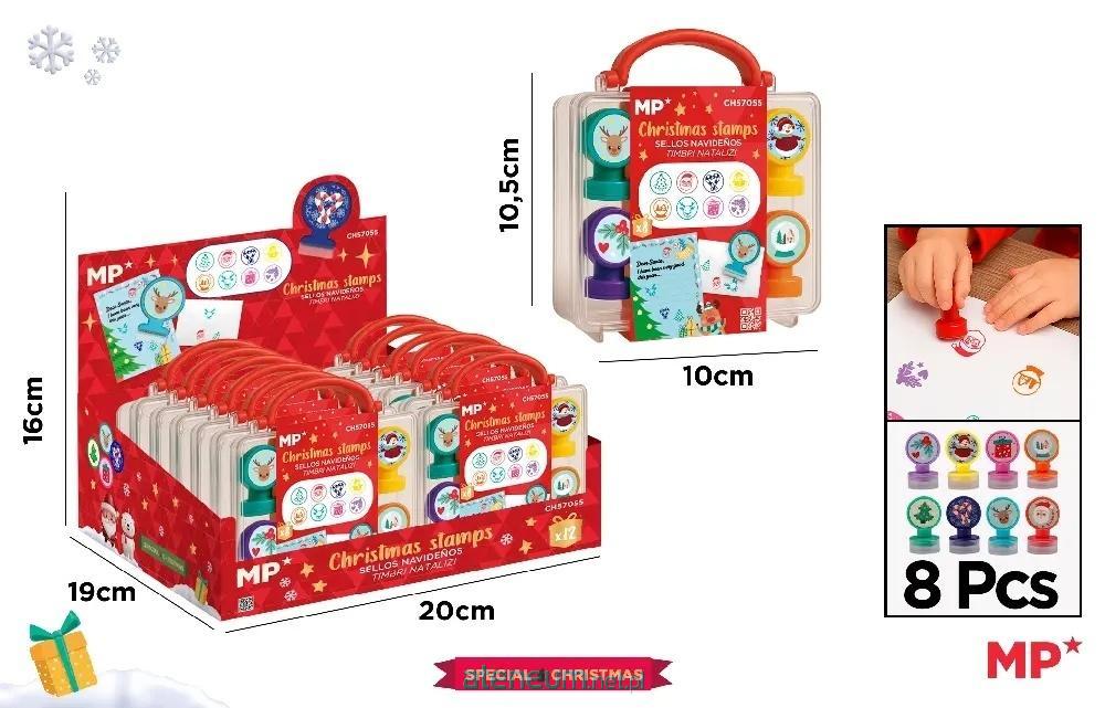 Świąteczny zestaw stempelków. Zawiera plastikową walizkę 10x10.5cm. 8 różnych wzorów stempli, tusz w kolorze różowym.
