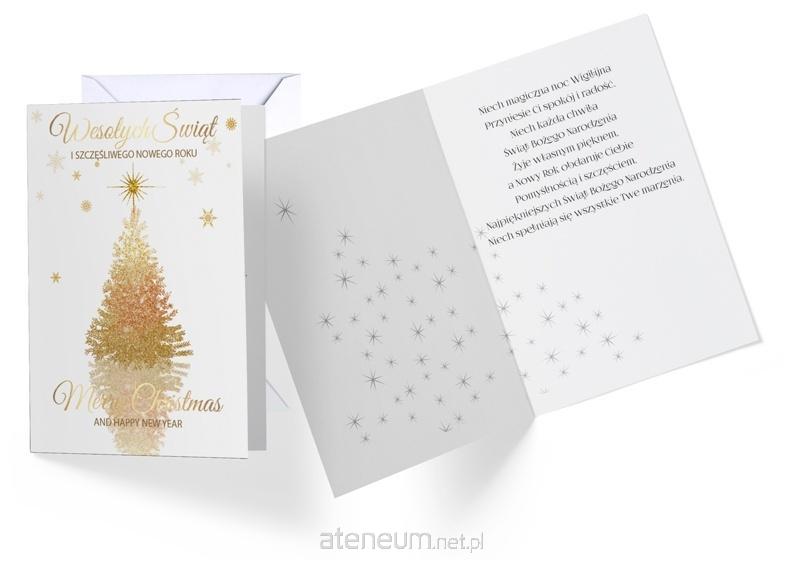 Kartka wielkości B6, zdobiona w zależności od wzoru metaliczną folią lub brokatem. Każda kartka posiada kolorowe życzenia w środku i koperte.