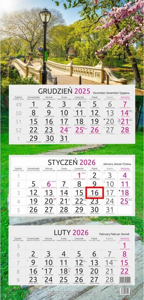 32 x 67 cm czterojęzyczne kalendarium PL, GB, D, UA z numeracją tygodni i imieninami, bieżący miesiąc wyróżniony kolorystycznie pasek z czerwonym okienkiem, dziurka do zawieszenia druk czarno czerwony ,3 osobne kalendaria po 12 stron