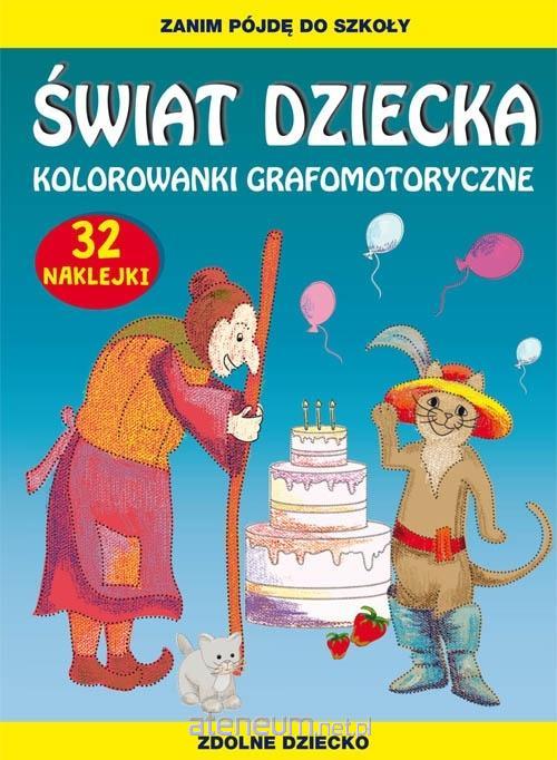 Książeczka edukacyjna dla przedszkolaków zawiera ćwiczenia grafomotoryczne przygotowujące do nauki pisania. Zadania polegają na rysowaniu po śladzie, kolorowaniu rysunków zwierząt i umieszczaniu naklejek w wyznaczonych miejscach. Dziecko, wykonując ćwiczenia grafomotoryczne, trenuje sprawność dłoni i palców oraz rozwija koordynację wzrokowo-ruchową.