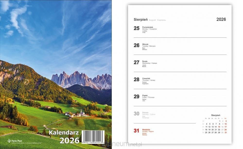 Kalendariumjeden tydzień na jednej stronie, w dolnym rogu skrócony kalendarz miesiąca.