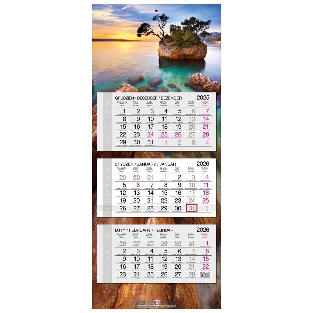 * kalendarz ścienny, trójdzielny z główką płaską z zadrukiem na całych pleckach