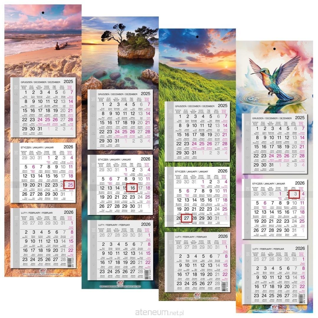* kalendarz ścienny, trójdzielny, wąski z główką płaską z zadrukiem na całych pleckach