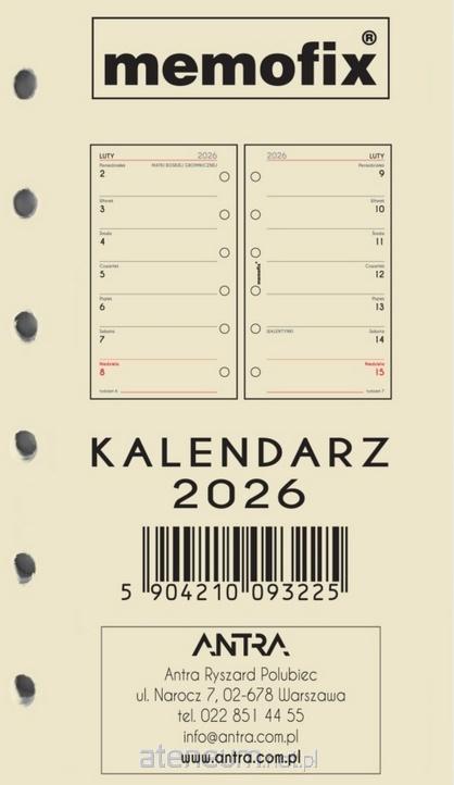 Wkład kalendarzowy 2026 Memofix A6 TNS (tydzień na stronie)