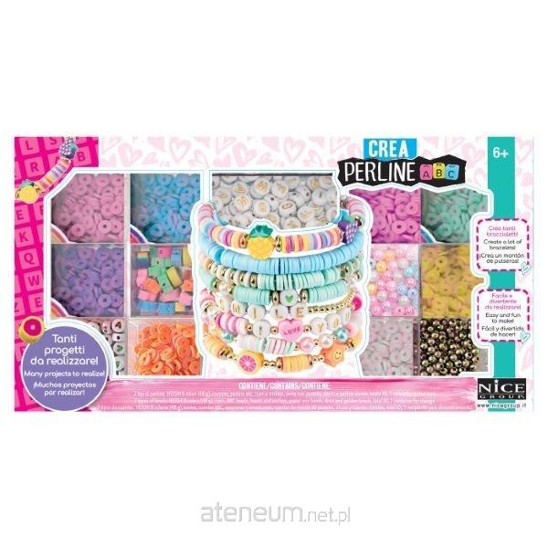 ZAWARTOŚĆ: pojemnik z pokrywką, ponad 500 koralików w różnych kolorach i kształtach (heishi, owoce, uśmiech, serca i litery), elastyczna nić w 3 kolorach.
