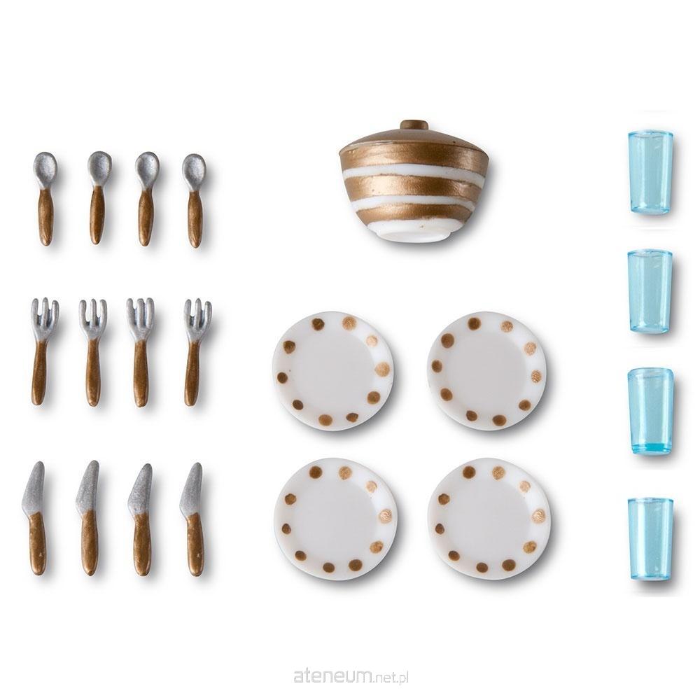 Dzięki eleganckiej zastawie obiadowej zabawa w domku dla lalek nigdy się nie kończy. Zestaw zawiera szklanki, talerze, łyżki, widelce i noże dla czterech osób. Nakrycie stołu uświetnia naczynie do serwowania z pokrywką.