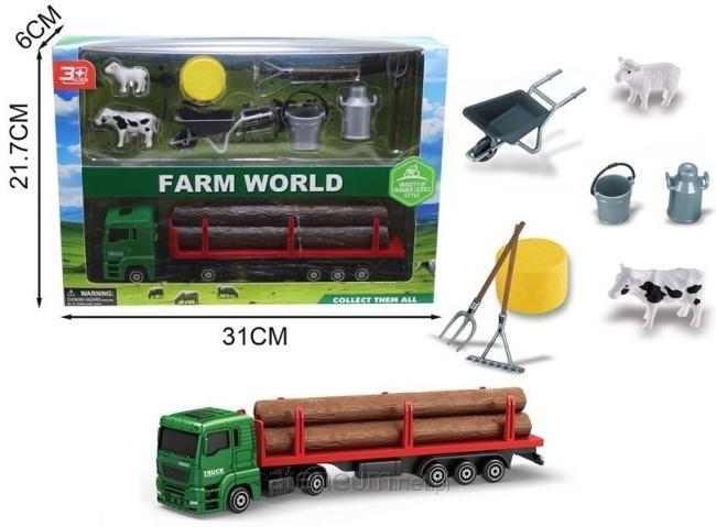 Przenieś się do świata FARM WORLD z zestawem, który zapewni godziny kreatywnej zabawy. Centralnym elementem jest duża, zielona ciężarówka logistyczna z naczepą przystosowaną do transportu drewnianych bali, które można załadować i rozładować, imitując prace leśne i rolnicze. Ciężarówka posiada sześć kół oraz realistyczny wygląd, zachęcając do odgrywania scenek. Oprócz pojazdu zestaw zawiera kluczowe elementy każdego gospodarstwa. Dzieci znajdą tu figurki zwierząt: białą owcę i czarno-białą krowę, które urozmaicą zabawę w farmę. Nie zapomniano również o akcesoriach: metaliczna taczka, dwa wiadra (szare i niebieskie), bańka na mleko, para wideł oraz grabi, a także duży, żółty balot siana lub sera. Ten zróżnicowany zestaw umożliwia odgrywanie wielu ról i sytuacji związanych z życiem na farmie i transportem, wspierając rozwój wyobraźni, kreatywności i koordynacji ręka-oko. Produkt jest bezpieczny i polecany dla dzieci powyżej 3 roku życia. Opakowanie o wymiarach 31 cm na 21.7 cm sprawia, że jest to doskonały pomysł na prezent. Zestaw FARM WORLD, to zaproszenie do zabawy pełnej przygód.