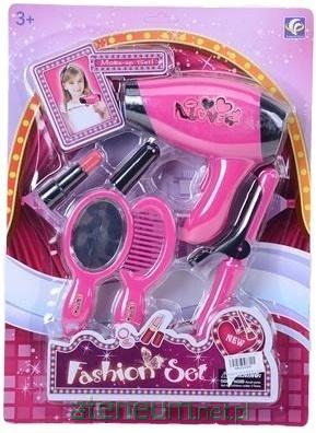 Fashion Set, to uroczy zestaw do stylizacji i makijażu, który zachwyci każdą małą elegantkę. Ten bogaty komplet zawiera wszystko, czego potrzebuje przyszła stylistka: różową suszarkę do włosów z motywem szpilki i napisem "I Love You", która jest centralnym elementem zestawu. Ponadto w blistrze znajdziemy praktyczne lusterko z wbudowanym grzebieniem, imitację szminki w eleganckiej czarnej oprawce oraz szczypce lub prostownicę do włosów. Całość utrzymana jest w żywej, przyciągającej wzrok różowej kolorystyce. Zestaw jest przeznaczony dla dzieci w wieku 3 lata i starszych, co potwierdza oznaczenie na opakowaniu. Zabawa tymi akcesoriami doskonale rozwija wyobraźnię, kreatywność oraz umiejętności społeczne poprzez odgrywanie ról. Jest to idealny pomysł na prezent, który pozwoli dziecku na bezpieczne eksperymentowanie ze swoim wyglądem i naśladowanie dorosłych. Wymiary i materiały są dostosowane do małych rączek, gwarantując bezpieczną i angażującą zabawę na długie godziny.