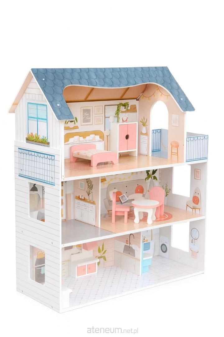 Ten piękny, drewniany domek dla lalek zachwyca szczegółami i starannym wykończeniem. Wykonany z solidnego drewna, ma klasyczną bryłę z niebieskim daszkiem oraz trzy piętra, na których znajduje się kilka pomieszczeń urządzonych w nowoczesnym stylu.
