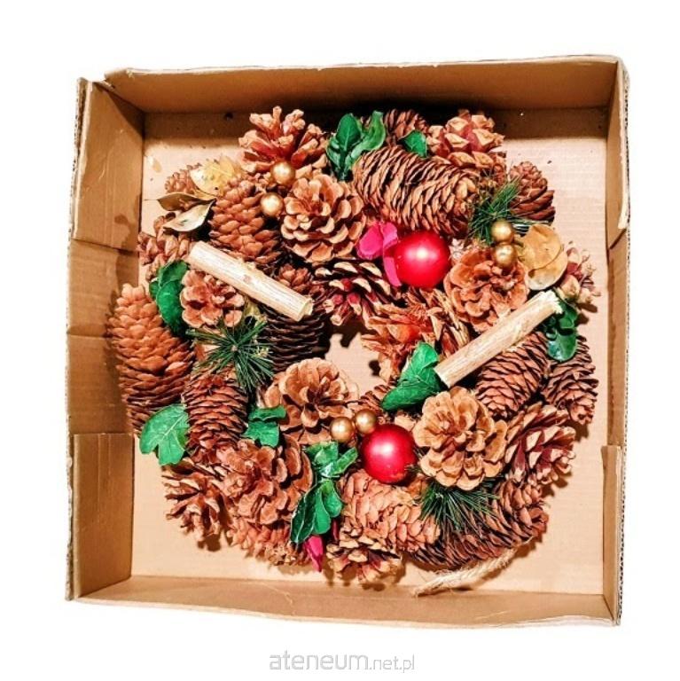 Okrągły, brązowe szyszki, czerwone bombki matowe, brązowe drewienka