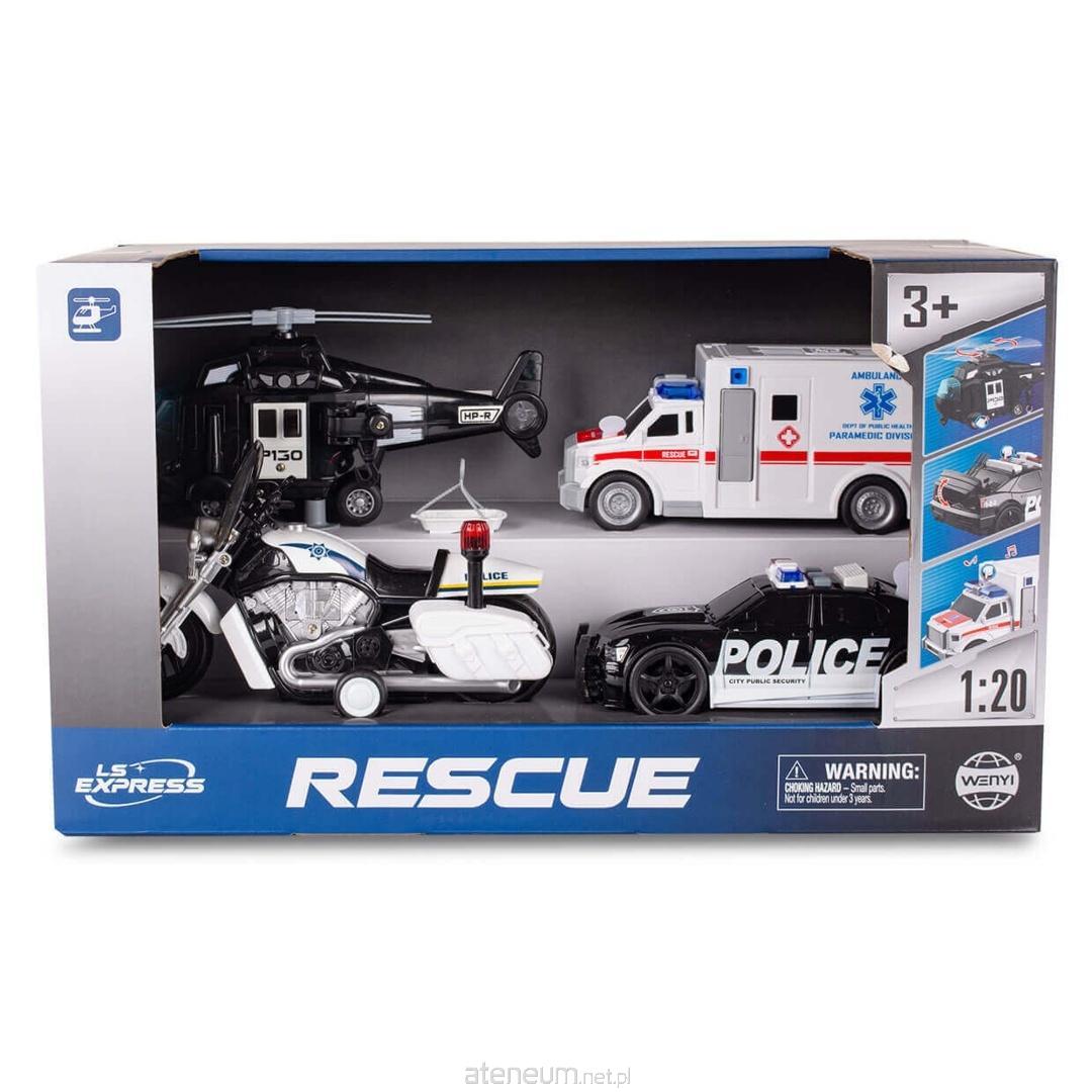 Zestaw zawiera: helikopter, ambulans, radiowóz, motor policyjny