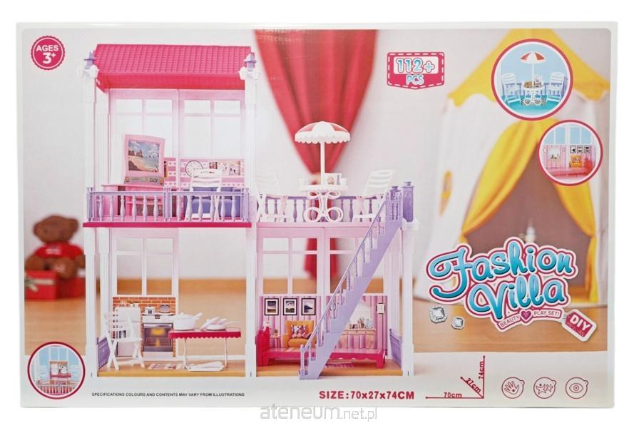 Zestaw domek dla lalek z wyposażeniem. W skład zestawu wchodzi dwupiętrowy domek oraz mebelki jak: krzesła, stoliki, łóżko i akcesoria np. garnki. Łącznie 112 elementów.
