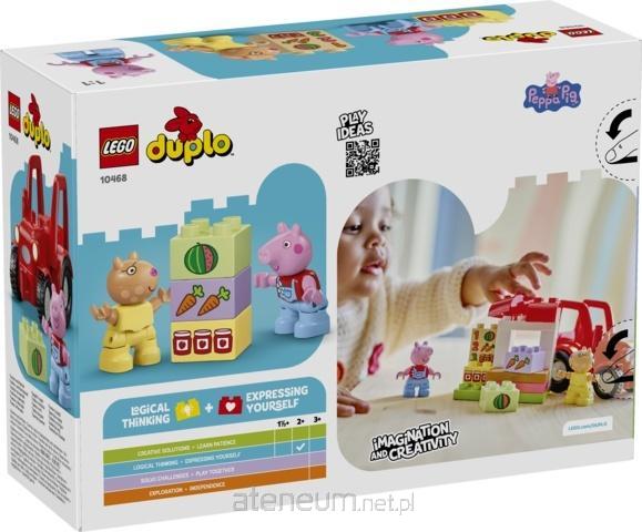 Pomóż maluchom rozwijać kreatywność dzięki zestawowi klocków LEGO Świnka Peppa Ciągnik i rynek (10468). Ta zabawka dla 2-latka, dla chłopca i dziewczynki pozwala wczuć się w zabawę w prowadzenie straganu z warzywami, zaopatrując go w klocki DUPLO przedstawiające produkty spożywcze na sprzedaż. Ten zestaw dla malucha do zabawy w odgrywanie ról zawiera figurki LEGO Kucyka Pedro i Świnki Peppy, czerwony traktor z obracającymi się kółkami oraz klocki w kształcie marchewki, arbuza i słoików z dżemem.