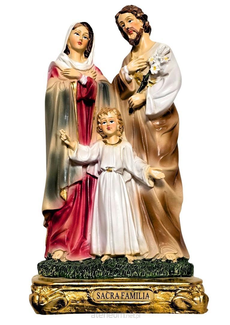 Odkryj głębię symboliki i ciepło rodzinnego wizerunku w tej uroczej figurce Świętej Rodziny. Jezus, z otwartymi ramionami i symbolicznym ułożeniem palców, przypomina o swojej dwoistej naturze. Maryja, ze złożonymi na sercu dłońmi, wyraża miłość i oddanie. Święty Józef, trzymający lilię, symbolizuje czystość i opiekę. Cała scena, umieszczona na podeście z napisem "Sacra Familia", emanuje spokojem i harmonią. Figurka o wysokości 22cm, wykonana z trwałej żywicy syntetycznej, stanowi wyjątkowy element dekoracyjny i duchowy akcent w każdym domu.