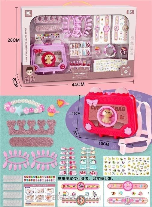 Ten bogato wyposażony zestaw akcesoriów to prawdziwe centrum kreatywnej rozrywki dla każdego dziecka. Głównym elementem kompletu jest stylowa, różowa torebka z paskiem na ramię, która wyróżnia się unikalnym designem przypominającym aparat fotograficzny z figurką pieska wewnątrz. Torebka pełni funkcję praktycznego kuferka na skarby, pozwalając na łatwe utrzymanie porządku po skończonej zabawie.