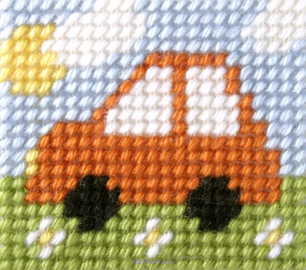 Zestaw do haftu z włóczką idealny dla dzieci i początkujących! Tkanina z nadrukiem, igła, włóczka i instrukcja w zestawie Wymiar haftu: 11 x 13 cm.