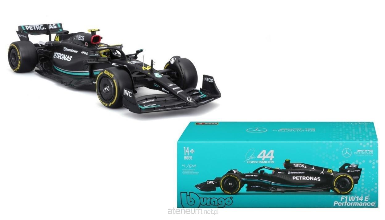 BOLID F1 Mercedes-AMG W14 E Performance (2023) #44 Lewis Hamilton oryginalny produkt marki Bburago, oficjalny, licencjonowany wzór pojazdu, metalowy model z plastikowymi elementami, perfekcyjne odwzorowanie szczegółów. model umieszczony na plastikowej podkładce oraz zamknięty w ochronnej gablotce. Długość bolidu ok. 23cm. Wymiary opakowania: 26 x 12 x 9cm. Mercedes-AMG F1 W14 E Performance to bolid Formuły 1 skonstruowany przez zespół Mercedesa na sezon 2023, prowadzony przez Lewisa Hamiltona i George\\'a Russella. Model W14 oparto na jego poprzedniku, W13, zachowując kluczowe koncepcje, takie jak wąskie sekcje boczne. Po raz pierwszy uruchomiono silnik bolidu pod koniec grudnia 2022 roku, a oficjalna prezentacja miała miejsce 15 lutego 2023 roku. W14 został pomalowany na czarno, aby zredukować masę i nawiązać do historycznego Saubera C12 z 1993 roku. Tego samego dnia samochód zadebiutował na torze Silverstone podczas shakedownu.
