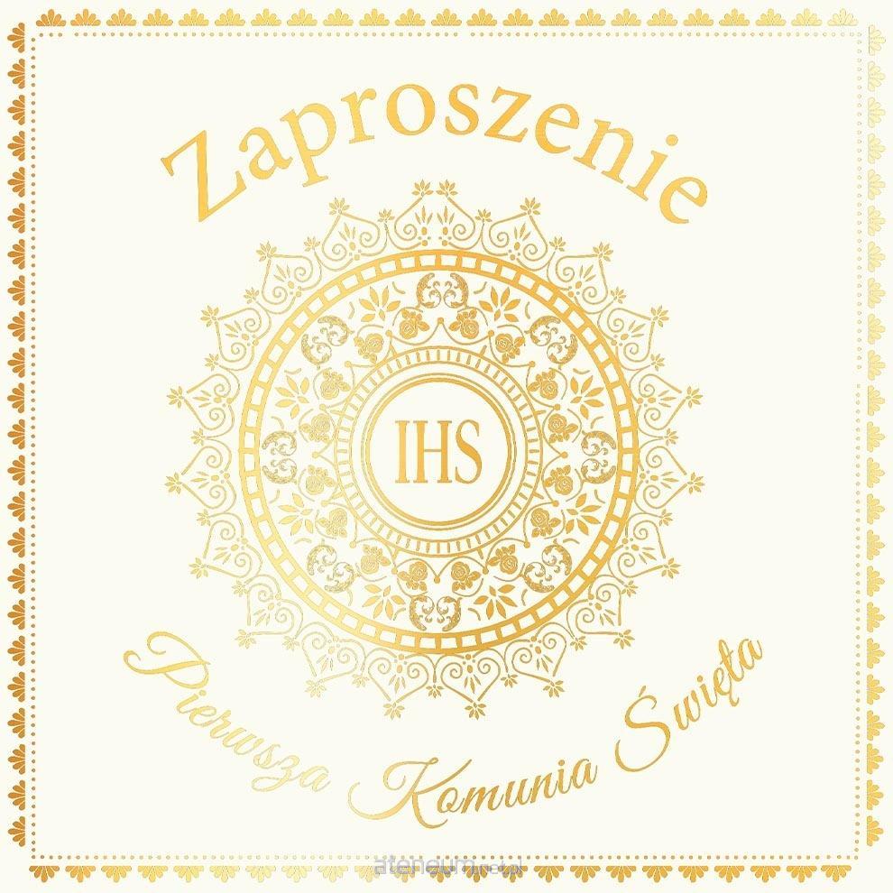 Zaproszenie w formacie kwadratu 1 5x 15 cm. Front złocony, w zestawie z wysokiej jakości kopertą. Pakowane po 5 sztuk.
