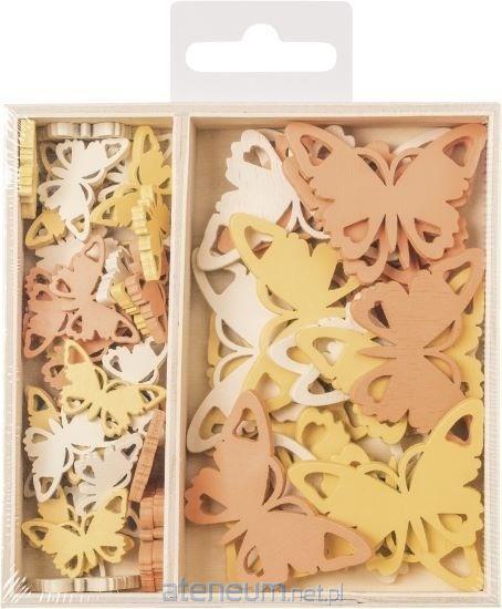 Drewniane pudełeczko z 54 elementami drewnianymi - motylki w trzech kolorach, w dwóch rozmiarach 2,5 cm i 4,5 cm.