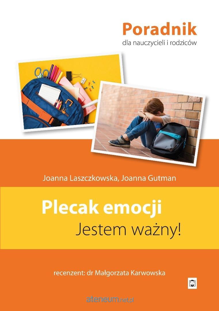 Poradnik o emocjach dla pedagogów oraz rodziców i opiekunów dzieci, a także dla wszystkich zainteresowanych wiedzą na temat emocji, napisany w bardzo przejrzysty i komunikatywny sposób.\n\n"To od nas nasze dzieci uczą się wielu zachowań tych właściwych oraz niepożądanych. My dorośli nie zawsze wiemy, jak reagować i higienizować własne emocje i uczucia. Często niewłaściwie interpretujemy i zbyt "gorąco" reagujemy na zachowania naszych dzieci. Może warto popularyzować wśród rodziców i nauczycieli postawę otwarcia. Powinniśmy w takich sytuacjach zrozumieć, że nie ma złych i dobrych emocji, albowiem wszystkie emocje są nasze i mamy prawo je odczuwać. Treści zawarte w "Plecaku emocji" są takim drogowskazem, jak rozmawiać, jak interpretować oraz jak szanować marzenia, plany i emocje drugiego człowieka oraz jakie zastosować praktyki uważności do odnalezienia dobrych rozwiązań pedagogiczno-terapeutycznych. \n[] poradnik wpisuje się w aktualne potrzeby pedagogiczno-społeczne i może stanowić atrakcyjną i merytorycznie poprawną propozycję nie tylko dla wymienionych adresatów, ale także sugerowałabym, by rozpowszechnić go wśród szerszego grona odbiorców. [] treści [] zredagowane są w sposób logicznie spójny, przejrzysty i komunikatywny. [] z tej wiedzy mogą z dużym zyskiem dla siebie skorzystać wszyscy, których zainteresuje problematyka emocji i budowania dobrych relacji". (z recenzji dr Małgorzaty Karwowskiej - wykładowcy akademickiego, pedagoga specjalnego, logopedy, terapeuty)\n\nJoanna Laszczkowska - absolwentka Uniwersytetu Kazimierza Wielkiego w Bydgoszczy, dyplomowany nauczyciel edukacji wczesnoszkolnej, oligofrenopedagog, socjoterapeuta. Jej pasją i celem jest zdobywanie wiedzy na temat emocji i budowania głębokich więzi międzyludzkich.\n\nJoanna Gutman - absolwentka Uniwersytetu Szczecińskiego, dyplomowany nauczyciel edukacji wczesnoszkolnej i przedszkolnej z terapią dziecka. Od kilku lat pracuje z uczniami, opierając się na programach profilaktyczno-wychowawczych i promocji zdrowia psychicznego.