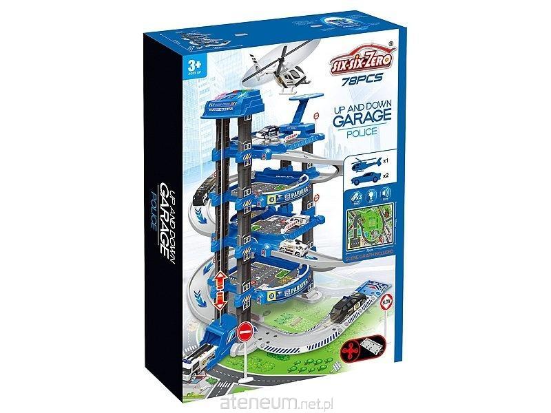 Parking policyjny, wielopiętrowy, z windą, 78 części, wym.rozłożonego 67x60x32cm, światło, dźwięk, pojazdy; 50,5x37,5x8,5cm