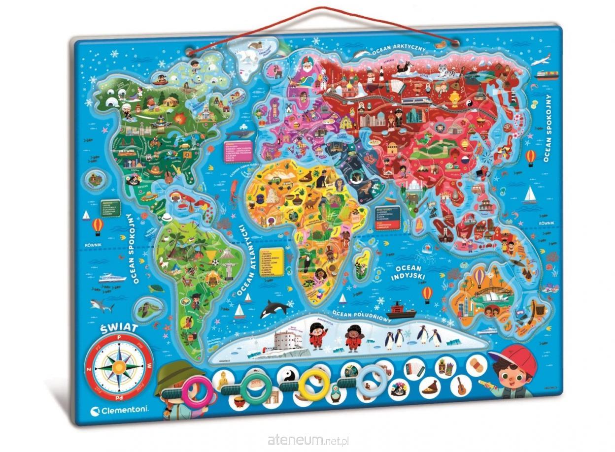 Kolorowa magnetyczna układanka do odkrywania świata. Zawiera grę edukacyjną, która pozwala odkryć unikalne cechy każdego regionu. Układanka wykonana jest z wytrzymałej tektury, odpowiedniej do zabawy z magnesami. Praktyczny sznurek umożliwia zawieszenie. Gra oferuje podwójne doświadczenie eksploracyjne: fizyczna mapa świata, do której można przymocować magnesy, aby odtworzyć mapę polityczną.