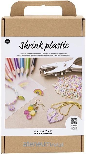 \nPlastikowe arkusze termokurczliwe można bardzo łatwo pokolorować kredkami - i fajnie jest obserwować, jak motywy kurczą się w piekarniku (wypiekanie pod nadzorem osoby dorosłej!). Efektem są niepowtarzalne i kolorowe wisiorki i zawieszki. Znajdź instrukcje z tyłu pudełka lub zeskanuj kod QR prowadzący do instrukcji online.