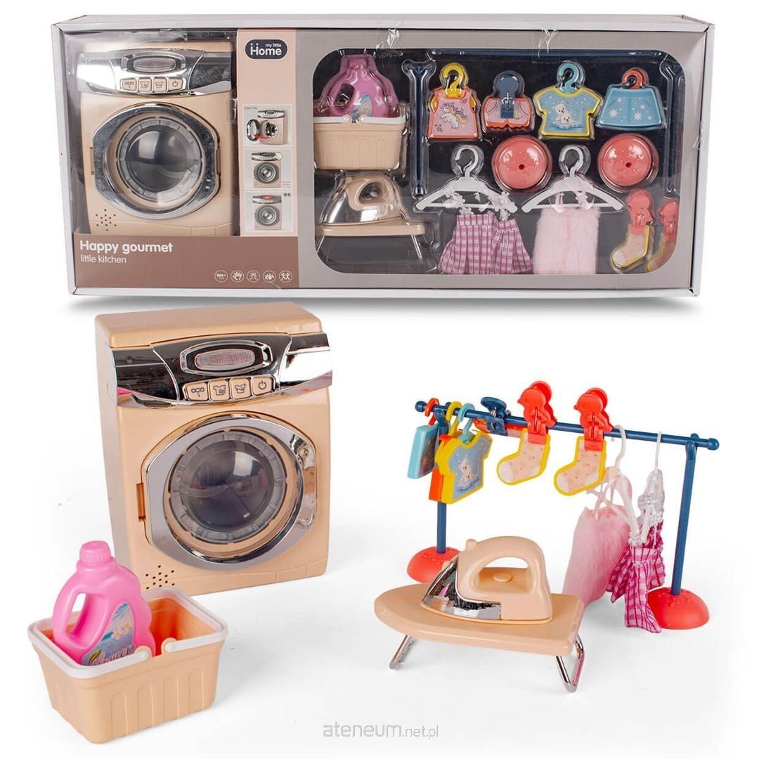 W zestawie z pralką zabawkową dziecko znajdziemy również liczne akcesoria do prania i prasowania, które uatrakcyjniają zabawę w dom. Do dyspozycji jest żelazko z deską do prasowania, koszyk na pranie oraz suszarka na ubrania. Zestaw zawiera także komplet 6 wieszaków, 5 plastikowych ubranek, 2 sukienki oraz 3 klipsy do ich mocowania. Całość uzupełnia buteleczka płynu do prania, która pozwala odgrywać pełen proces domowych czynności. Tak rozbudowany komplet sprawia, że zabawa jest realistyczna, kreatywna i wciąga dziecko na długi czas.