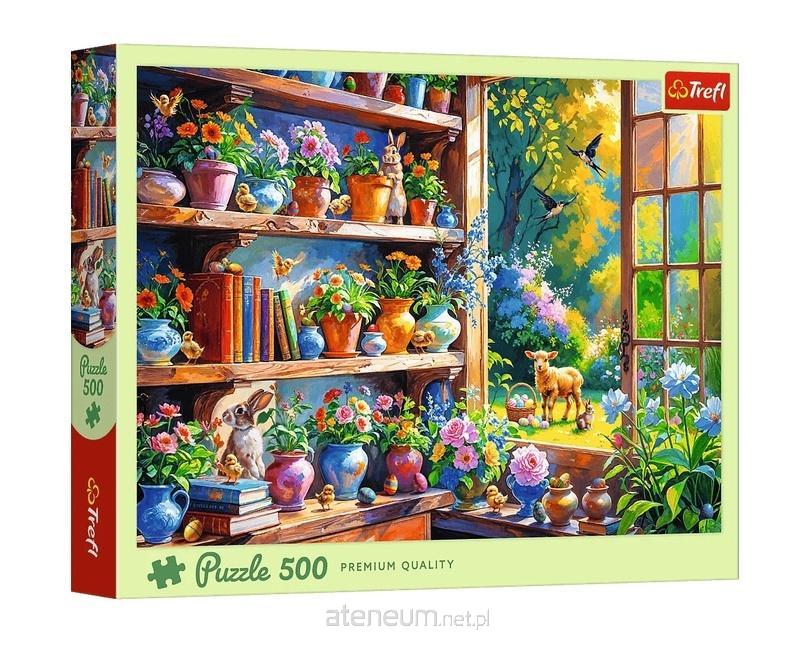 Puzzle 500 elementów Wiosenny poranek w oranżerii przedstawiające pełne kolorów wnętrze oranżerii z kwitnącymi roślinami i małymi zwierzętami, przez którego otwarte drzwi widać słoneczny ogród z jagnięciem i wielkanocnymi akcentami. Po ułożeniu powstanie obrazek o wymiarach 48x34 cm. Wysoką jakość, nasycenie kolorów i bezpieczeństwo układania zapewnia kalandrowany papier odbijający światło, pokryty ekologicznymi farbami spożywczymi.
