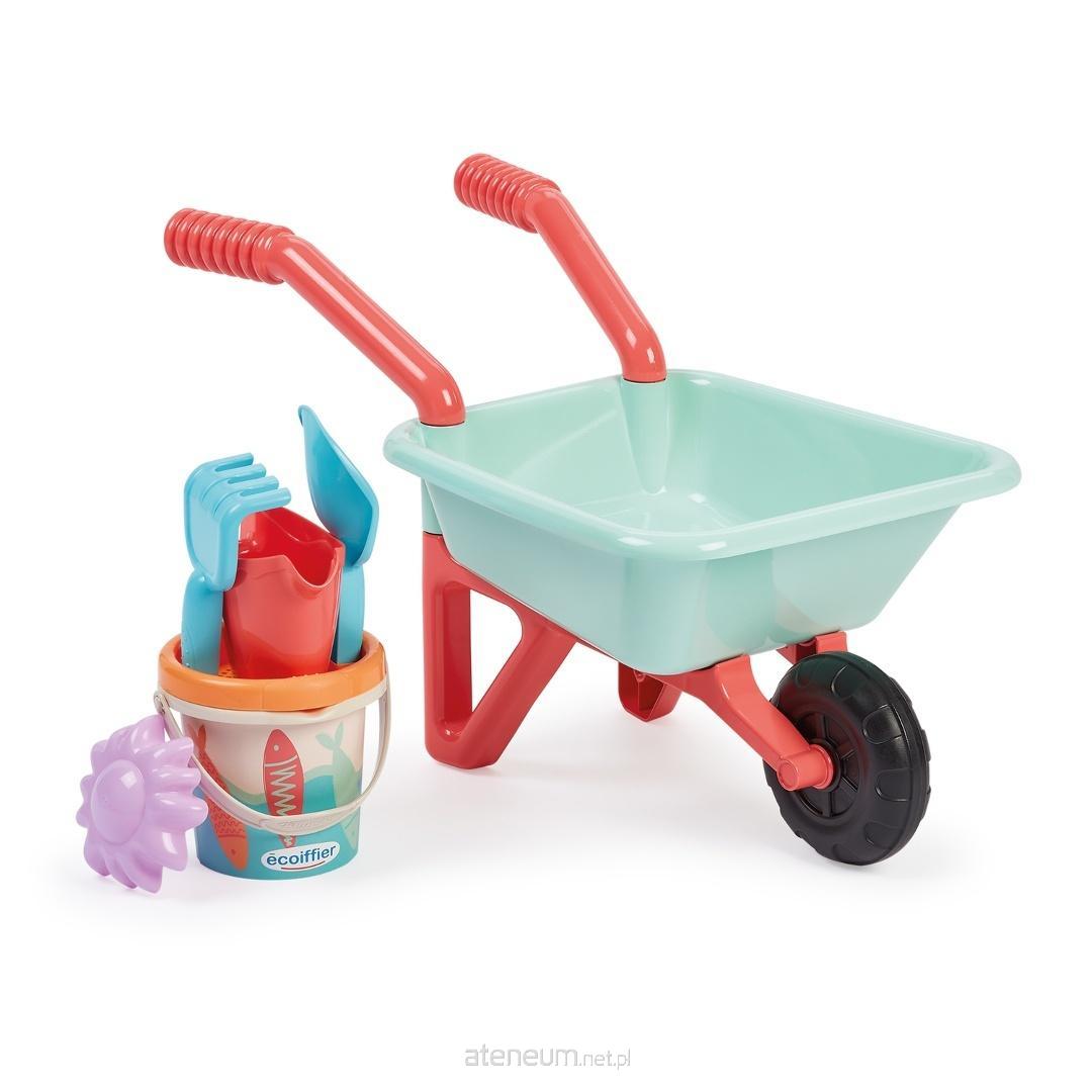 EC Taczka z akcesoriami do piasku \nTaczka z 1 kółkiem, w zestawie wiaderko 12 cm, łopatka, grabki, sitko oraz foremka do piasku. Wyprodukowane we Francji. \nWymiary: TBC, 18m+