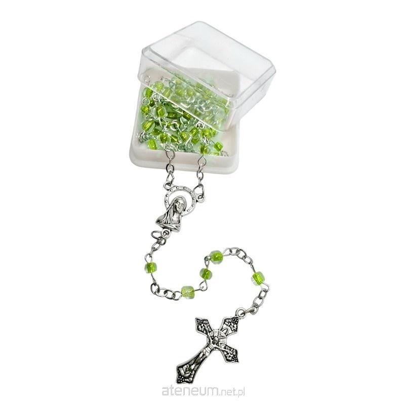 Koraliki różańca wykonane są z przeźroczystego plastiku, w którego środek ma żywy, zielony kolor. Takie połączenie nadaje im wyjątkowej elegancji i atrakcyjnego efektu wizualnego. Koraliki mają około 4 mm wielkości.
