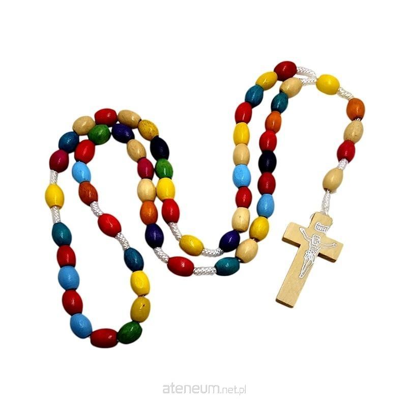 Różaniec składa się z owalnych, drewnianych koralików w różnych, żywych kolorach, które nadają mu radosnego i nietuzinkowego charakteru. Koraliki o wielkości 8x10 mm są przyjemne w dotyku i idealnie układają się w dłoni podczas modlitwy. Całość nawleczono na wytrzymały sznurek, co zapewnia trwałość i wygodę użytkowania.