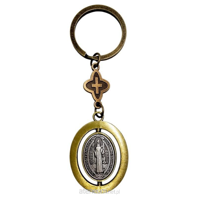 Zewnętrzna ramka breloka stylizowana jest na stare złoto, nadając mu szlachetny i klasyczny wygląd.Centralny, obrotowy element ma kolor srebrny, tworząc wyrazisty kontrast i prezentując dwa kluczowe wizerunki: z jednej strony znajduje się szczegółowa postać Świętego Benedykta, założyciela zakonu i potężnego orędownika, a z drugiej strony widnieje Krzyż Świętego Benedykta z jego charakterystycznymi inskrypcjami, będący symbolem ochrony przed złem i negatywnymi wpływami.