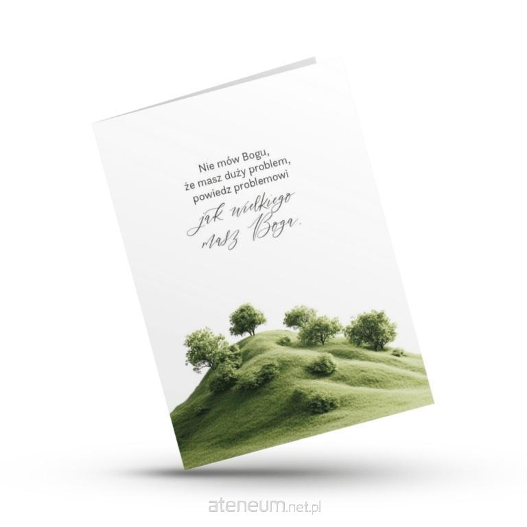 Kartka z cytatem z Ewangelii Jana 14,6 to wyjątkowe przesłanie nadziei i wiary w Jezusa Chrystusa jedyną drogę do Ojca. Urokliwa ilustracja w odcieniach zieleni przedstawia spokojny krajobraz z polną ścieżką i strumieniem.