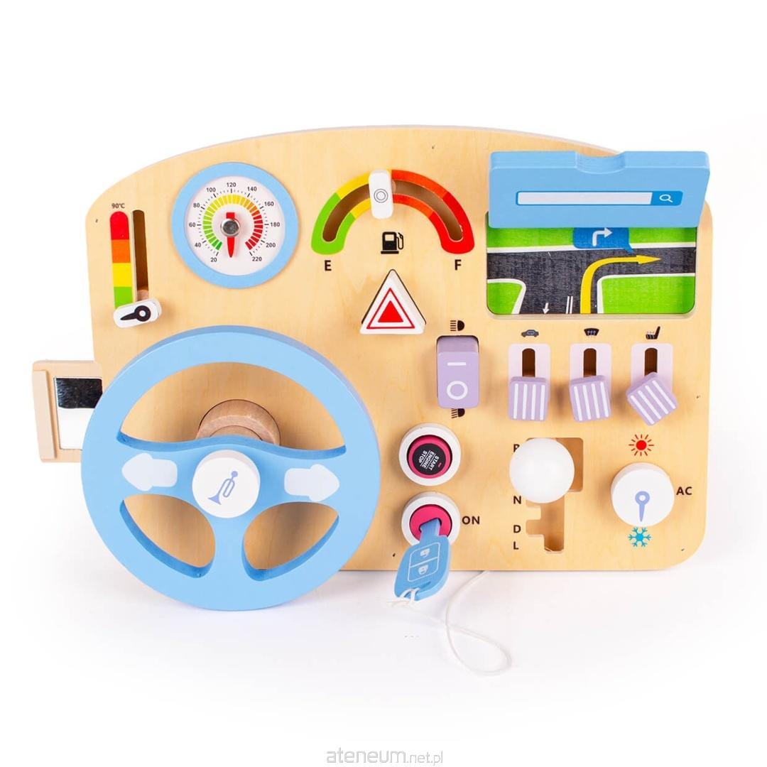 Tablica w formie kokpitu samochodu zachęca do zabawy w prowadzenie pojazdu. Dziecko może udawać jazdę, zmieniać "biegi" i sterować elementami jak w prawdziwym aucie. Taka zabawa rozwija wyobraźnię i pozwala naśladować codzienne czynności dorosłych. To naturalny sposób nauki przez zabawę.