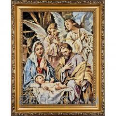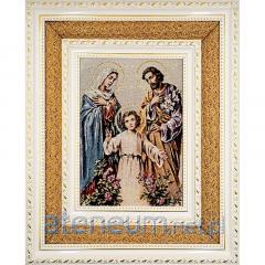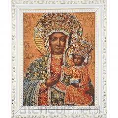 Piękne, nasycone kolory oraz kunsztownie wplecione złote nici nadają wizerunkowi serca wyjątkowego blasku i sakralnej podniosłości. Technika haftu tworzy unikalną, wypukłą fakturę, która ożywia postać Maryi, czyniąc obraz nie tylko przedmiotem kultu, ale i wyrafinowanym dziełem sztuki religijnej. Całość została oprawiona w elegancką, bogato zdobioną złotą ramę o szerokości około 3 cm, która idealnie dopełnia kompozycję.