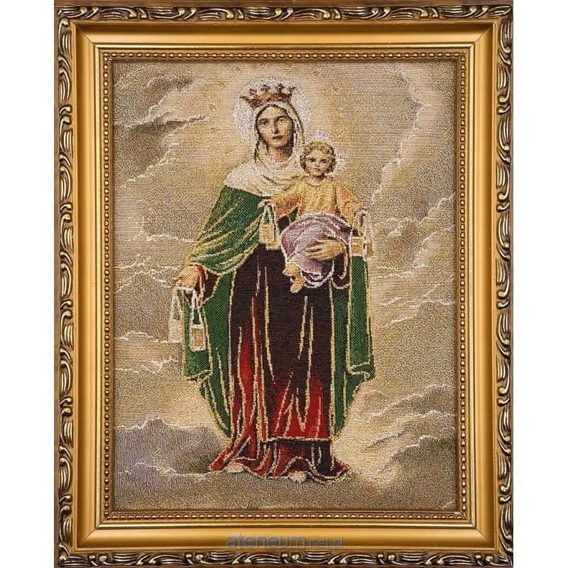 Zanurz się w pobożności i opiece Matki Bożej Szkaplerznej przedstawionej na tym wyjątkowym, haftowanym obrazie. Maryja czule trzyma Dzieciątko Jezus na lewej ręce, a w prawej dłoni dzierży szkaplerz - symbol Jej szczególnej opieki i przymierza. Dzieciątko Jezus również trzyma w obu swoich rączkach szkaplerz, podkreślając jego znaczenie i błogosławieństwo.Piękne, bogate kolory oraz dostojne złote nici nadają wizerunkowi Matki Bożej Szkaplerznej wyjątkowego blasku i świętości. Całość oprawiona jest w elegancką, zdobioną złotą ramę o szerokości około 3 cm, która doskonale podkreśla duchowy charakter dzieła. Obraz o wymiarach 22x27,5 cm będzie stanowił cenną ozdobę każdego wnętrza i inspirujący element pobożności maryjnej.