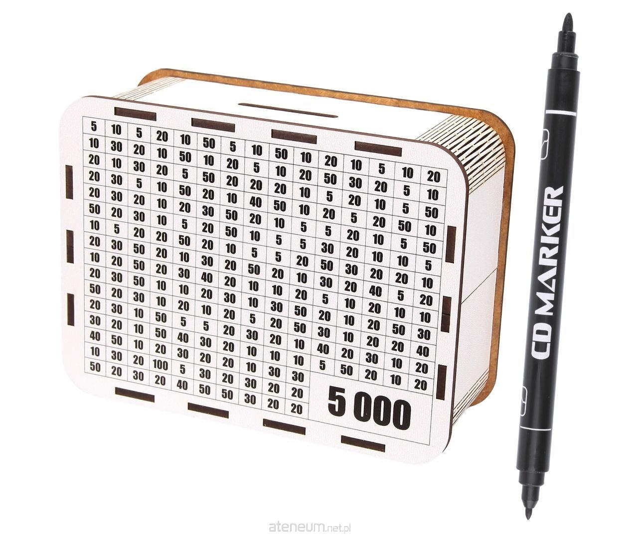 Na powierzchni skarbonki znajduje się tabelka, w której można wykreślać kolejne wartości nominałów banknotów lub bilonu w miarę dodawania gotówki. Po wykreśleniu wszystkich pól skarbonka będzie zawierać 5000zł Posiada specjalny otwór na górze do wrzucania monet i banknotów.