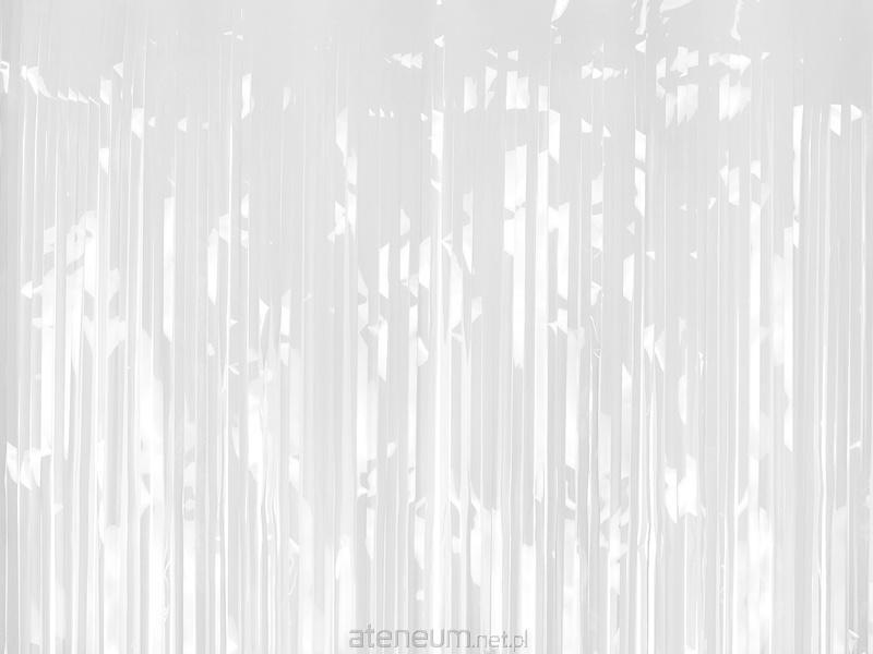 Kurtyna Party metalizowana w kolorze białym, szerokość ok. 100 cm, wysokość ok. 200 cm. Wykonana z folii o grubości 23 um.