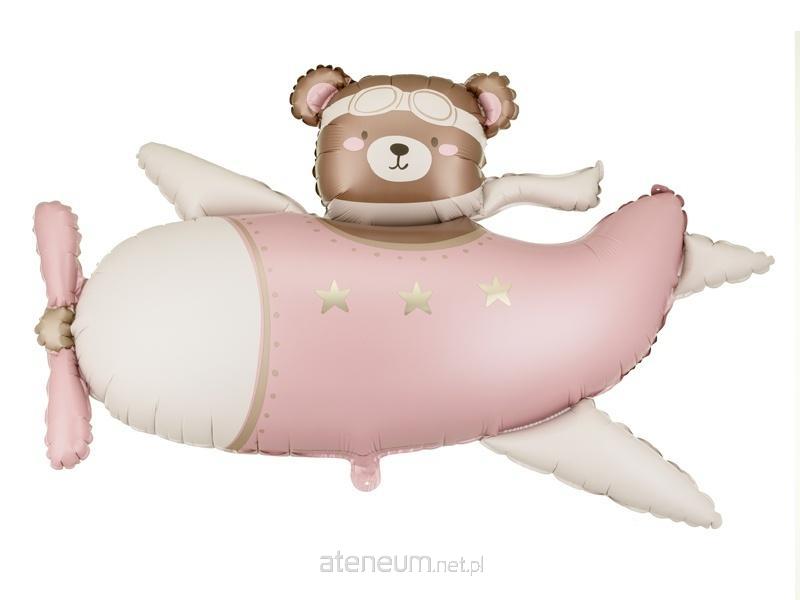Balon foliowy Miś w Samolocie, w kolorze kremowo-jasnoróżowym. Wymiary przed napompowaniem ok. 111 x 81,5 cm (43,7 x 32,1\\'\\'), wymiary po napompowaniu ok. 94 x 61 cm (37,0 x 24,0\\'\\'). Do napompowania powietrzem i helem. Zestaw zawiera słomkę.