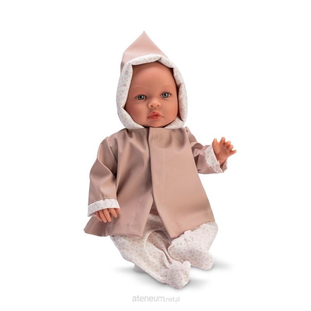 Lalka hiszpańska marki ASI ubrana jest w bawełniane białe śpioszki o delikatnym wzorze oraz płaszczyk przeciwdeszczowy w kolorze pudrowego różu.