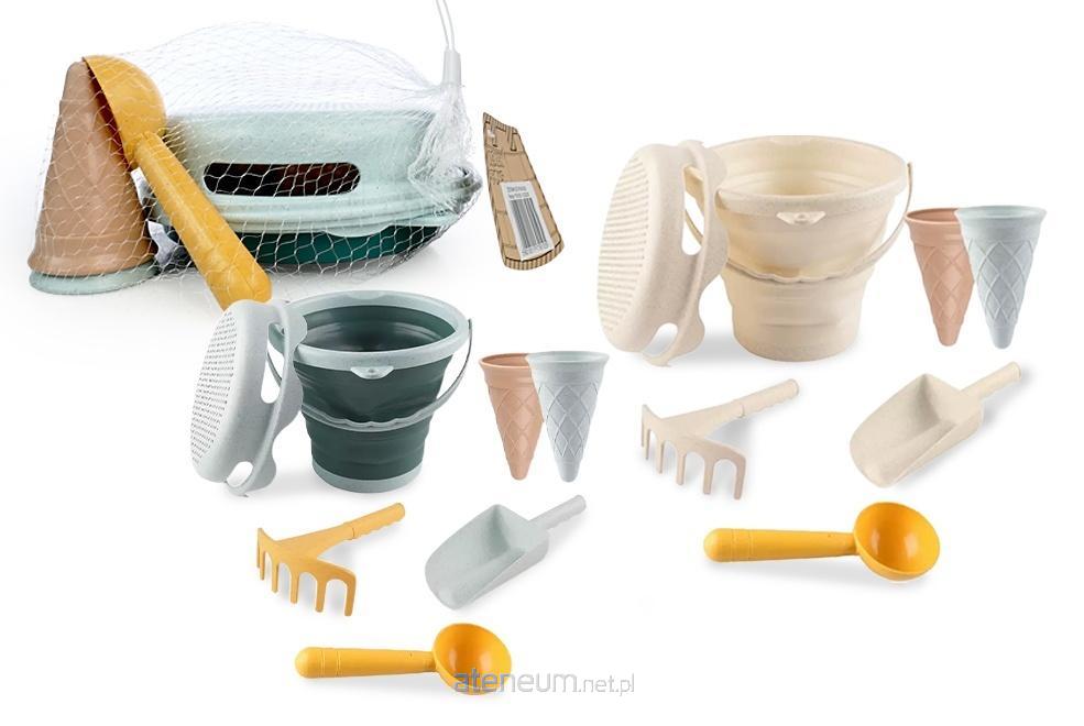 2 wzory; w zestawie: wiaderko wys. 21 cm, sitko śr. 20 cm, łopatka, grabki, łyżka, 2 foremki rożków lodowych; 3+