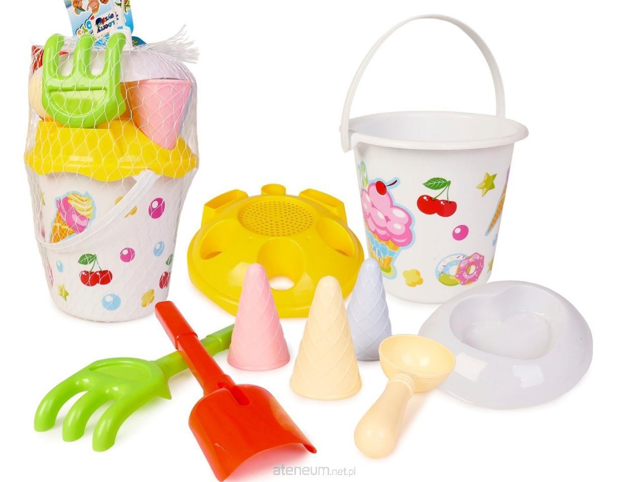 W zestawie: wiaderko wysokość: 15,5 cm; pokrywka-sitko (przesiewacz do piasku) średnica: 17,5 cm, łopatka długość: 26,5 cm; grabki długość: 26 cm, łyżka długość: 15 cm; 3 x foremki do piasku w kształcie rożków lodowych długość: 15 cm; funkcje: tworzenie zamków, babek, lodów z piasku, przesiewanie i filtrowanie piasku, kopanie i przenoszenie piasku za pomocą łopatki, grabii lub łyżki; wym. opakowania: 17 x 28 x 18 cm, 3 +