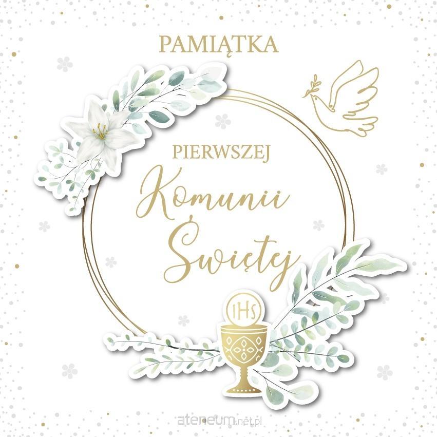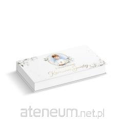 Książeczka z Okazji I Komunii Świętej w formacie A5 wraz z kopertą w środku.