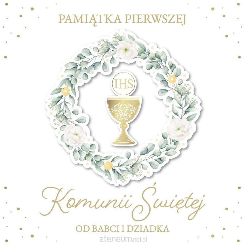 Książeczka z Okazji I Komunii Świętej w formacie A5 wraz z kopertą w środku.